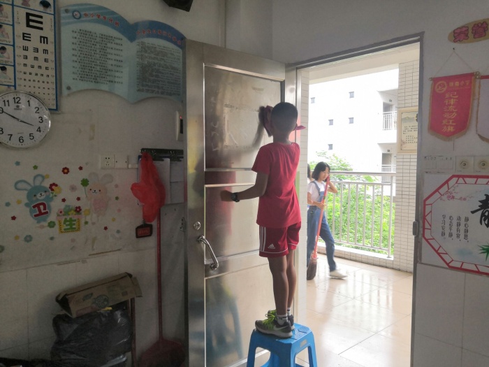 看!在老師的帶領、分工下,家長志愿者與同學們各司其職,完成教室、功能室的打掃!
