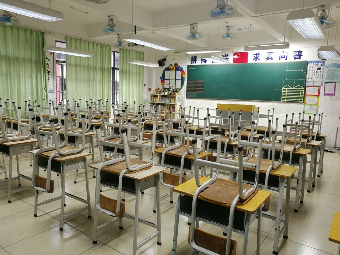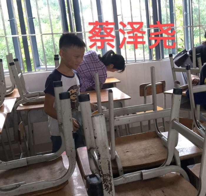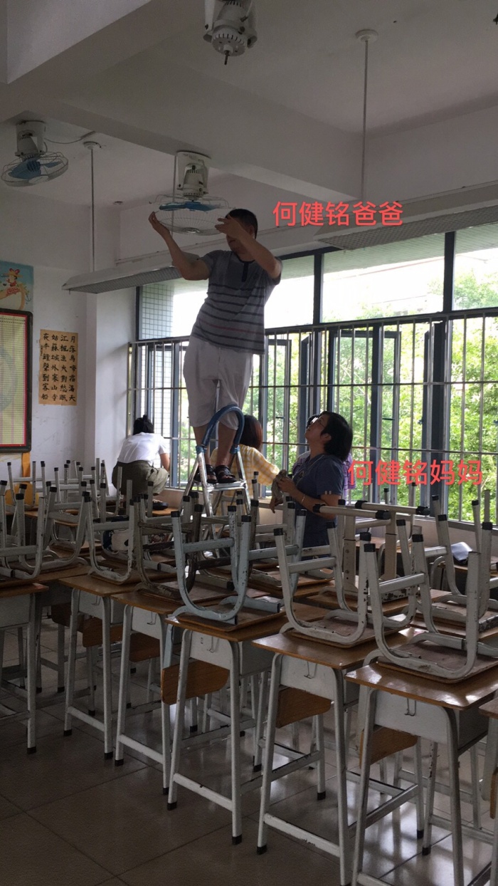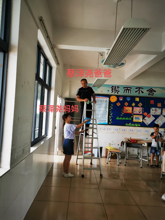 瞧!家長們把所有的電風扇、桌椅、地板、黑板、門窗、窗簾擦洗得干干凈凈!每一次擦拭都帶著溫柔的目光,那是因為對孩子們的愛!因為愛所以用心!