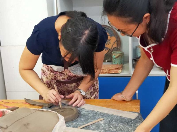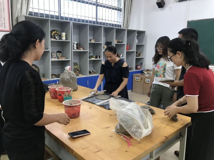 在學習制陶前,盧雅儀和林美婷老師向跟崗老師們介紹了學校的陶藝特色的發展狀況。兩位陶藝教師結合自己多年的陶藝教學工作經驗,從學校陶藝的普及、社團的常規管理、活動計劃、課題引領等不同的方面進行詳細的講解,讓跟崗老師們對學校的陶藝特色發展有了深刻的了解。