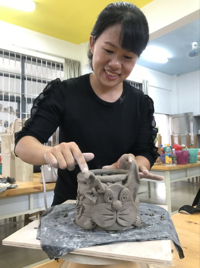接著,林美婷老師給跟崗老師講解陶藝的技法,現場示范制作陶罐,跟崗教師以高漲、飽滿的熱情認真聆聽、細心地制作他們喜歡的陶藝作品,有的做實用陶罐,有的做動物泥玩具,有的做了一本有意義“陶書”,銘刻教育的初心……他們一邊做一邊積極地和陶藝老師互動交流,不斷汲取陶藝的知識,互相分享教育的經驗心得。通過這次活動,跟崗教師從遠距離的校園文化觀摩到近距離的泥巴觸摸,再到一件件陶藝作品的呈現,讓每位跟崗教師真切的感受到陶藝的樂趣,也感受到鎮南陶藝教師的熱情和專業水平,這樣特別的培訓和交流,也讓鎮南小學陶藝教師在教的同時收獲了友情。