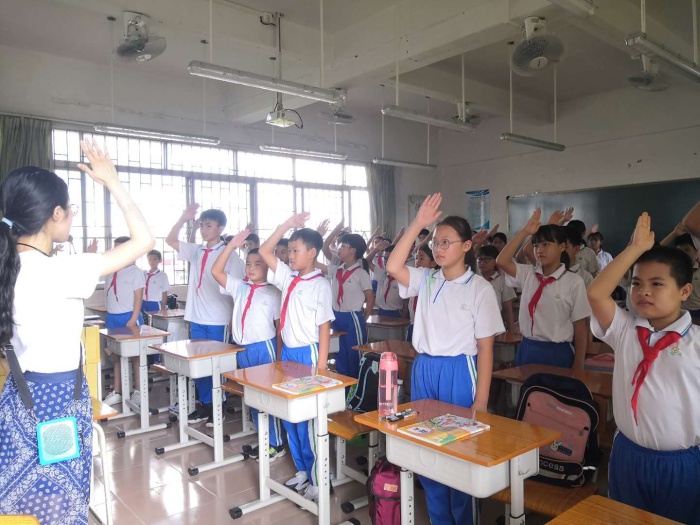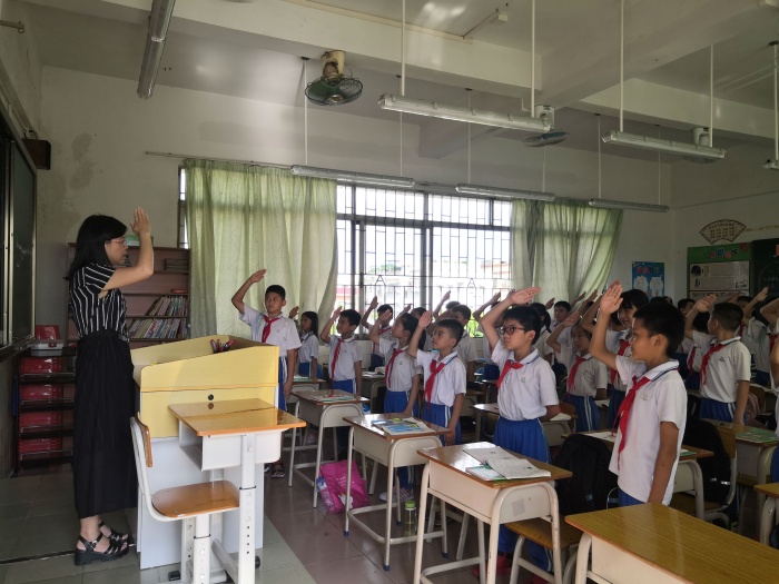 班會課上到最后,所有學生起立為我們遇難的同胞、抗戰的英雄敬禮,表達我們深深的敬意,今天的和平來之不易!