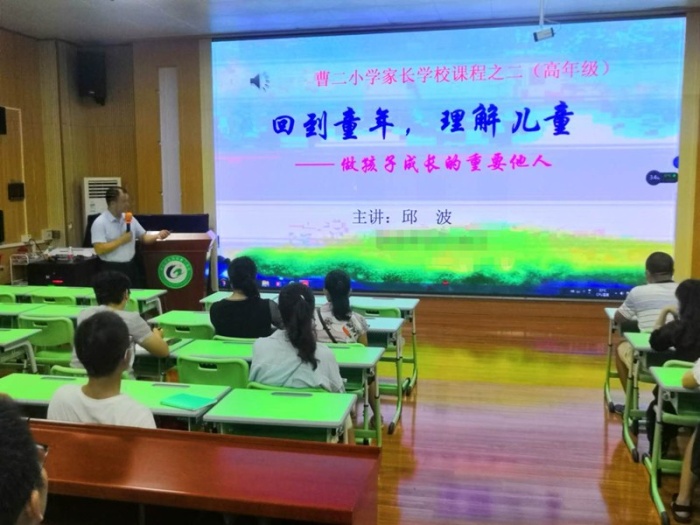 此次家長會分為兩個流程:一是由邱波校長主講的針對高年級學(xué)段的講座《回到童年,理解兒童》;二是家長到各班級參加由班主任組織召開的家長會。