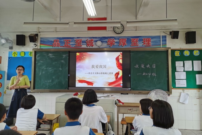 2020年9月28日,中山市曹步中學初三(2)班開展了一次以“我愛我國”為主題的班會。本次班會旨在加強學生對祖國的熱愛,讓學生更有國家榮譽感。