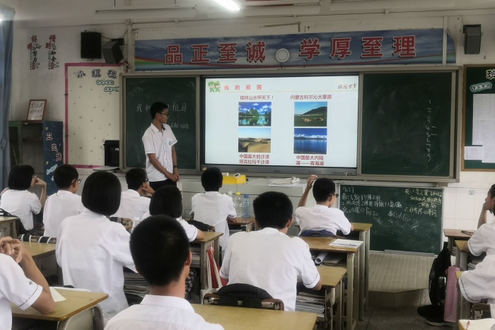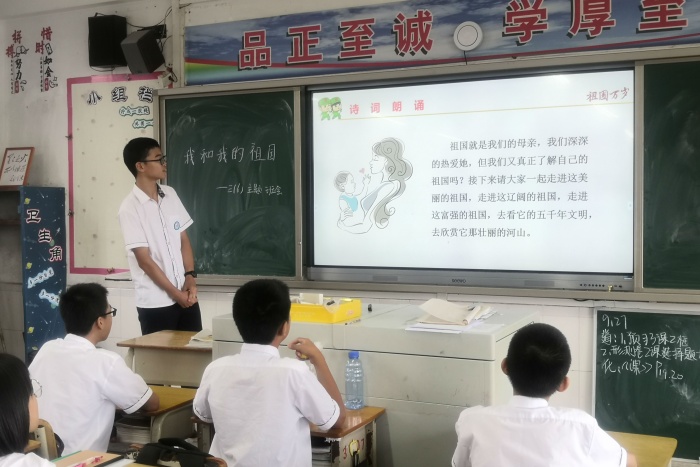 第三章為“熱愛祖國”。最后,班長趙軒同學提出了中學生愛國的做法,相信同學們一定都會銘記于心中。臨近結束,班主任歐陽艷珊老師播放了《我和我的祖國》視頻,不少同學都被觸動到心靈,眼里不僅是晶瑩的眼珠,更是對祖國的愛。