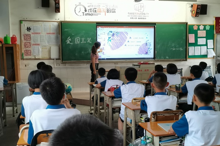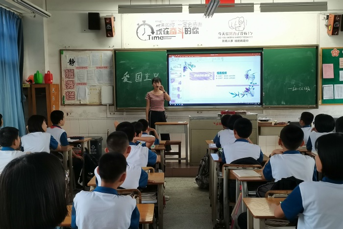 班主任毛茜老師首先提問學(xué)生,祖國在大家心里是什么含義?同學(xué)們紛紛發(fā)表了自己的看法。毛老師趁大家情緒漸佳,馬上展開了第一個(gè)流程,通過引入一些歷史上較為有名的愛國人士的故事,向同學(xué)們展現(xiàn)了什么是愛國。而后,毛老師詢問:為什么愛國呢?同學(xué)們通過實(shí)例深刻感受到“有國才有家,有家才有我”這雖然簡(jiǎn)單但也道出真理的話語。中國現(xiàn)在生活環(huán)境能這么好,更應(yīng)該值得大家去珍惜,去愛護(hù)。