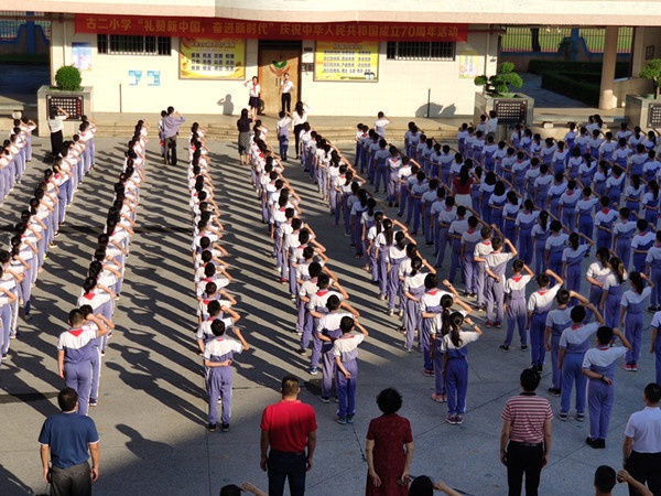 紅色華誕,國旗飄揚!為慶祝中華人民共和國成立71周年,弘揚偉大的愛國主義精神,引導同學們樹立正確理想、信念,培育和踐行社會主義核心價值觀,9月30日,古鎮鎮古二小學在學生中深入開展了愛國主義教育系列活動。