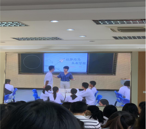 第二環節是學習中山市華僑中學陳曉新老師的職業生涯課--《以夢為馬,未來可期》。陳老師開門見山提問學生你的夢想是什么并闡釋了夢想的含義。接著在“我的生活愿景”卡牌活動中讓學生從66張生涯愿景卡牌中選10張填寫“我的生涯愿景”摩天輪,分類、分享自己的卡牌。然后以梅耶馬斯克的案例指引學生要規劃好自己的職業生涯。最后在“職業購物車”中讓學生選擇自己的職業。內容引人入勝,學生課上情緒高漲,每位學生都配合融入課堂。