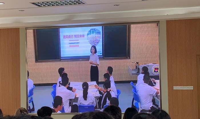 第一環節是觀摩中山市桂山中學鄧秀平老師的職業生涯規劃課--《遇見自己,預見未來》。鄧老師以游戲“老師說”激發學生興趣并告訴學生未來掌握在自己手里。課中讓學生跟隨著時光機,想象十年后的自己;以發朋友圈的方式描繪自己十年后的四個場景并讓學生分享自己的朋友圈。過程趣味十足,注重培養學生發掘自己職業規劃的能力。