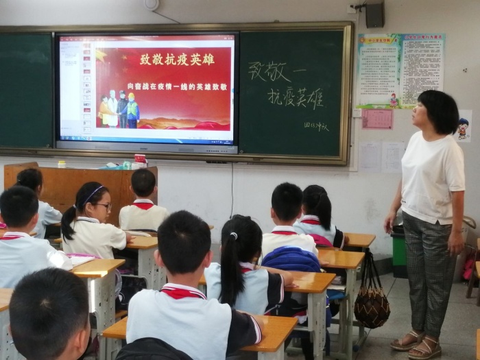 班會主要分為四個部分:班會寄語、向逆行的抗疫英雄致敬、每一代抗疫英雄的事跡和立下志向,齊聲宣誓。