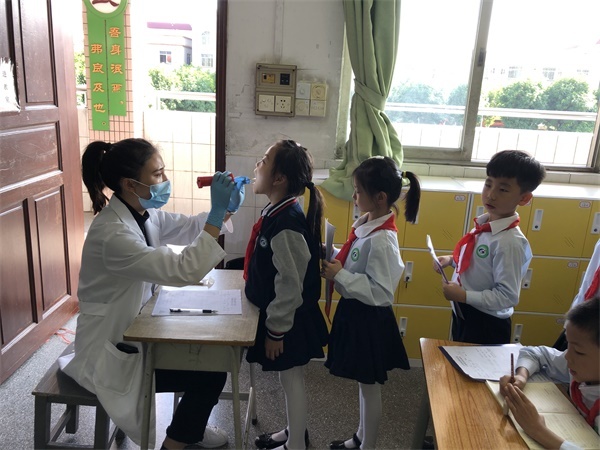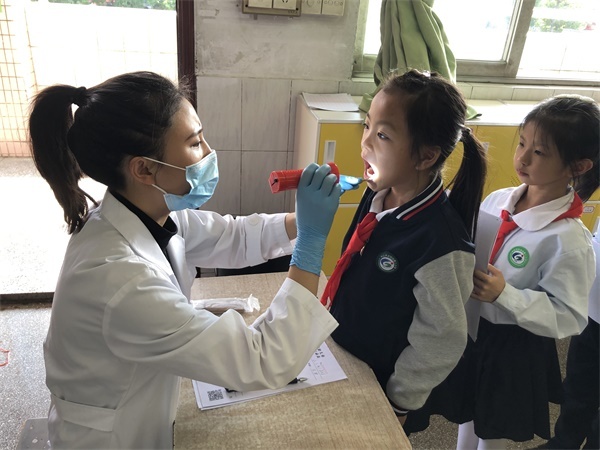 中環(huán)口腔門診的工作人員分別從牙列分期、蛀牙的內(nèi)涵以及產(chǎn)生原因、蛀牙的危害等多方面給同學(xué)們普及了口腔知識(shí)。隨后,工作人員還通過詼諧的言語(yǔ),生動(dòng)地講解了正確刷牙的方法。同學(xué)們聽得津津有味,紛紛表示以后都會(huì)注意個(gè)人的口腔衛(wèi)生,爭(zhēng)做愛牙護(hù)牙小衛(wèi)士。宣講結(jié)束后,同學(xué)們意猶未盡。緊接著,工作人員耐心地給曹二小學(xué)的學(xué)生檢查口腔和牙齒,并根據(jù)他們的口腔情況告知其注意事項(xiàng)。檢查結(jié)束后,同學(xué)們?cè)诠ぷ魅藛T的帶領(lǐng)下,一起齊讀《護(hù)齒歌》,似乎在用整齊響亮的聲音來(lái)證明自己保護(hù)牙齒的決心。