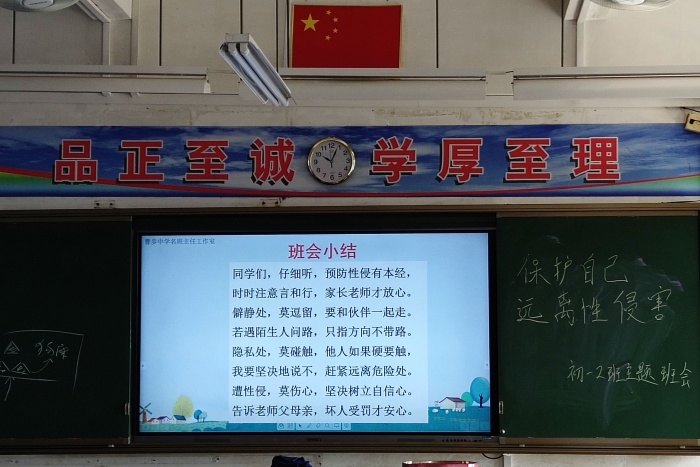 為了防止惡性事件的發生,教育學生保護自己,2020年10月12日上午第二節曹步中學初一(2)班進行了以“保護自己,遠離性侵害”為主題的班會課,初一(2)班班主任李佳寧老師及全班39名學生參與了這次班會課。