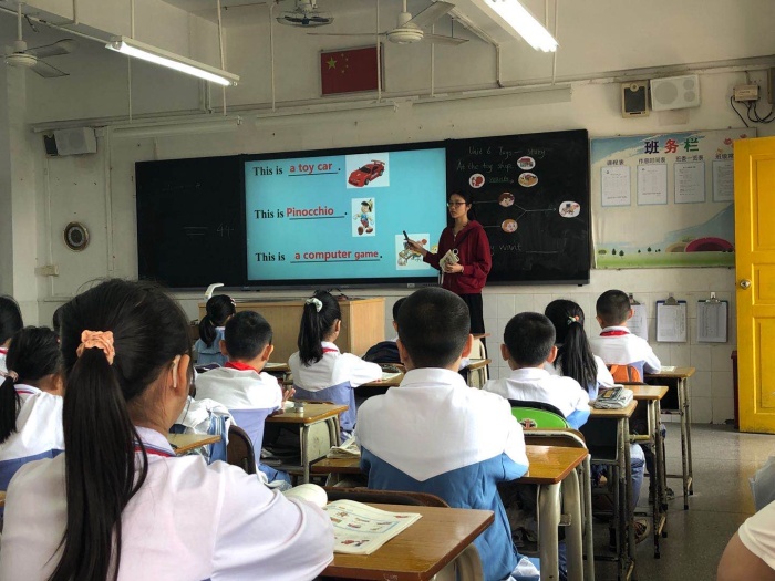 林捷漫老師執教四(3)班“Unit 6 Toys (Story)”。課前,林老師通過短片“George wants a dinosaur”作為切入,實現課堂激趣,并引入課題“Toys”。課中,林老師以問題串聯課堂,提出問題“What does Gogo want?”,使學生在觀看故事視頻中進行那個整體感知,再聚焦到文中細節,讓學生在閱讀中找出問題答案。在教學過程中,林老師善于引導學生進行課文研讀,并巧用板書思維導圖,引導學生進行故事復述。課后環節,林老師設計小組角色扮演環節,教具多樣,結尾以開放性問題“Why do they want Gogo?”作為升華,啟發學生思考,實現遷移創新。