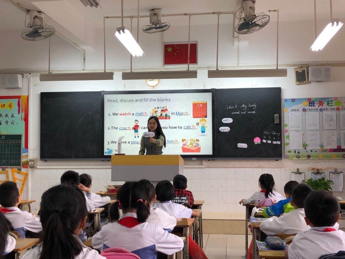 王嘉慧老師與四(1)班的學生帶來語音課課例“Unit 5 My Body (Sounds and words)”。王老師以Touching Game和歌曲“Bench, peach”作為引入,調動學生的積極性,引導學生對學習重點“ch”的發音進行整體感知,并通過語篇“Watch a match”,結合簡單的思維導圖,板書本節課重點語音詞匯,讓學生在語篇的引領下,帶著任務進行合作探究與學習,思路清晰。最后,王老師拓展繪本“The Ostrich’s Lunch”,展示“lunch、cheese、chips、peach、too much”等詞,對學生進行循循善誘,既鞏固本節課重點“ch”的發音,又使學生明白平衡飲食的重要性,從而實現學生的有效生成。