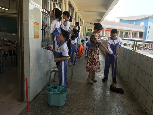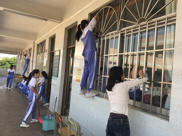 14:25分各班主任先在本班做好分工工作,安排學生負責衛生清理區域,包括教室、包干區以及綠化區,并選出區域負責人,其中有個別高年級學生被叫去幫忙打掃室場;14:30分由負責人帶領相應學生到清潔區域,在班主任的帶領下,學生積極參與,各盡其職,齊心其力,對校園進行了認真清掃,包括擦窗、桌椅、拖地、拔草等,把全校各個角落清潔地干干凈凈。雖然天氣有些炎熱,正好是下午最熱的時候,但是大家依然冒著炎熱,樂在其中,同學們的歡笑聲響徹校園。15:10分基本完成大掃除,15:15分全部打掃完回教室,由班主任進行點評。放學后學校衛生組組織成員,對今天下午的清潔進行檢查、評價及公布,并且對做的好方面給予表揚,做的不好的方面提出整改意見。