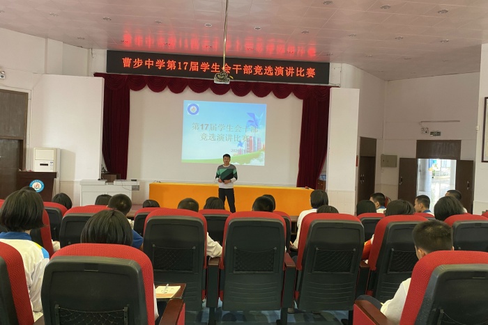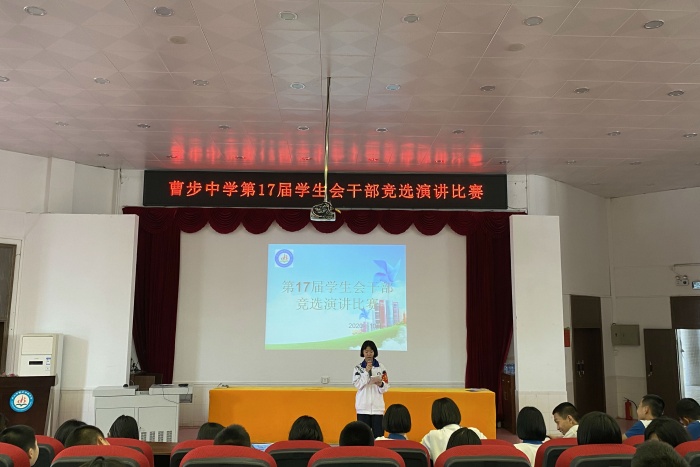 為了促進學生會的發展,培育并選拔第17屆優秀的學生會干部,2020年10月21日中午,曹步中學召集全體學生會成員在一樓報告廳進行每人三分鐘的演講。演講的內容為自己對一年來學生會生活的體會,以及自己準備競選的干部職位和打算。本次演講比賽由學生會指導老師賀坤主持。