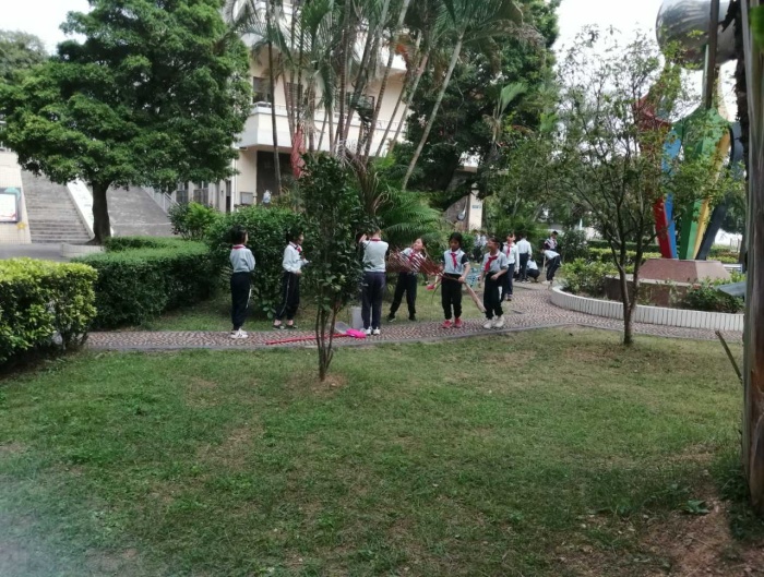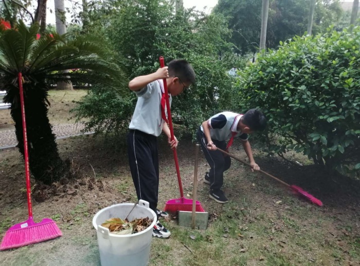 活動在午練時進行。三年級的孩子們帶上手套、掃把、垃圾鏟和垃圾桶興高采烈地來到花園里。年級組長韋丹麗老師向同學們詳細講述了這一次活動的主要任務和勞動分工后,同學們聽從老師的指揮,彎起腰,蹲下去,擼起袖子,三兩成堆,邊說邊循著有草的地方,用力抓緊草根,使勁拔,把一棵棵影響校園美觀的雜草除掉。三年級的孩子雖然小小年紀,但他們不怕臟,不怕累,不懼怕地上的昆蟲和螞蟻,認真地完成老師安排的任務。話動中,同學們個個干勁十足,不忽視每一個細節,不放過每一個死角,一棵棵雜草被同學們一雙雙有力的小手鏟除掉。同學們邊說邊笑,熱火朝天地快樂勞動著,此時,安靜的校園被孩子們勞動中的歡聲笑語感染著,洋溢著活力的氣息。芭蕉樹掉下的枯枝,又長又大,很難處理,這個難題把同學們困住了,不知怎么處理。這時,突然有一個同學冒出一個好主意,“踩著中間,折成兩段,放進垃圾桶里”。大家都為這個同學豎起大拇指。在同學們團結合作、互幫互助的努力下,花園又重換干凈、整齊的新面貌。同學們看到自己的勞動成果,心里美滋滋的。