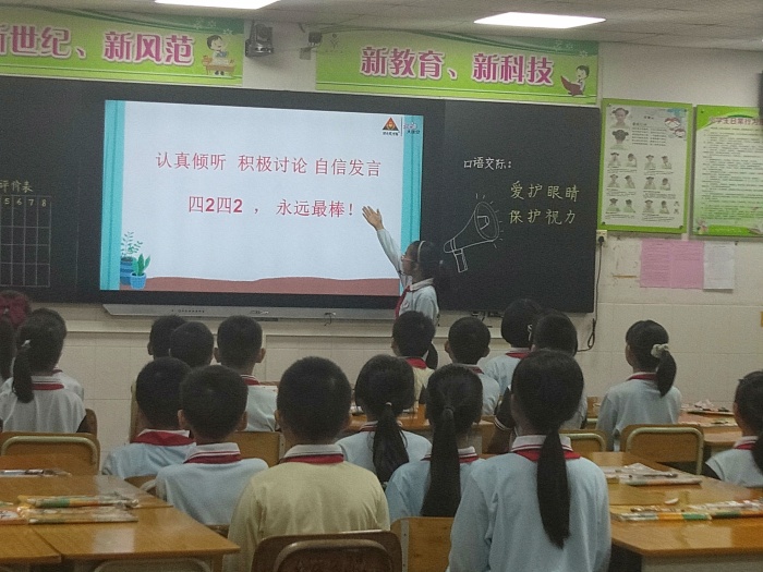 在課堂上,陳老師教態自然大方,通過目標導向,讓學生明確學習目標。接著通過視頻導入、課前調查分析、小組合作討論,小組上臺展示,課堂知識拓展等環節教學。陳老師的課堂設計有梯度,由易到難,使學生更好地接受知識。通過交際訓練,學生能說出影響視力的原因、保護視力的措施,突出了口語交際訓練的本色。課堂中班長擔任小老師,老師從旁指導,師生與生生間精彩的互動交流將課堂氛圍推向高潮。