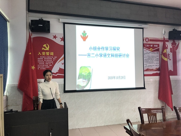 10月29日,為了落實課改的要求,在教育教學上大力推行適合小學語文課堂的小組合作模式,結合古二小學以及各自班級的實際情況,研究探討小組合作學習的模式,利用周四下午語文科組科研活動時間,在三樓會議室,進行了一場別開生面的“小組合作”研討會。本次會議由科組長黃藝容老師主持,古二小學副校長袁潔云校長也參加了本次活動。