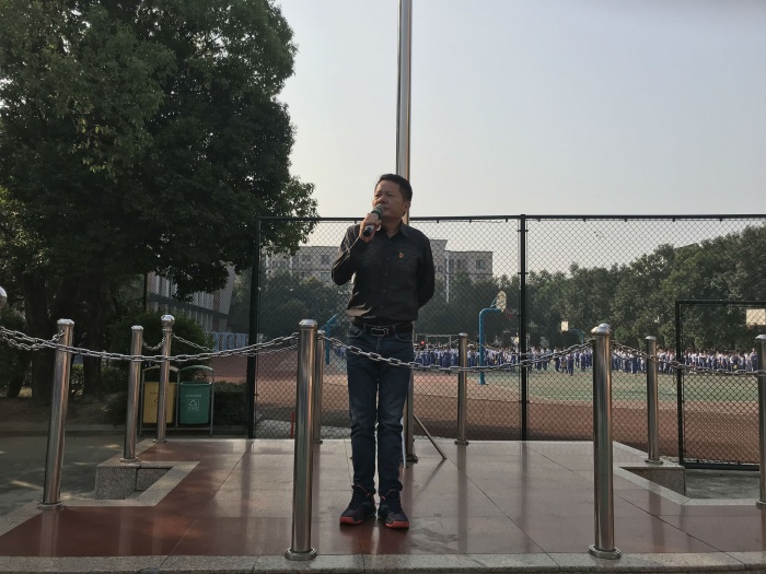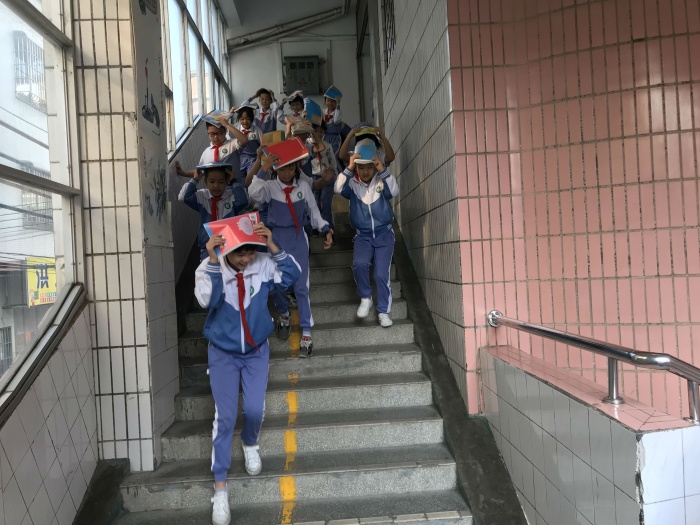 上午第一節課下課,校園各樓梯口疏導人員提前就位,警報響起后,學校防震緊急疏散演練活動正式開始。首先學校廣播發出地震預警信號師生迅速躲避,學生蹲在課桌兩側或課桌底,手交叉或用書本等物品護住頭部。隨后廣播發出疏散信號,每班第一節的任課老師按照安排疏散順序,帶領學生按照疏散路線迅速、有序地疏散到指定的“安全地帶”。全體學生到指定位置集合,清點人數,并上報級組長,最后各班整理隊伍,陳校長點評本次防震疏散演練,強調防震演練的重要性。