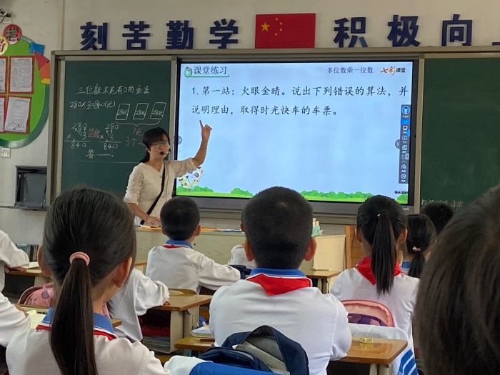 首先,通過復習口算,為學習新知作鋪墊。其次,創設情境,探索新知。創設乘法王國認識新朋友的情境,激發學生學習的積極性,在閱讀與理解時,羅小靜老師重視讓學生分析題目,理解題意。緊接著,引導學生通過獨立完成,小組討論豎式計算注意的地方,既培養學生獨立思考的能力,同時培養學生小組合作交流的能力,讓學生與學生之間產生思維的碰撞。然后,歸納概括,總結提升。通過小組合作,歸納概括三位數末尾有0的乘法計算方法,加深學生對算理的理解,同時培養學生表達概括的能力。最后,學以致用, 鞏固深化。通過分層次、多樣化的練習,幫助學生鞏固本節課的新知。