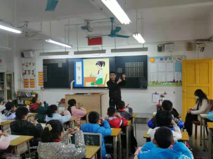 籃球強體魄,書法靜修身。為了向跟崗團隊展示海洲第二小學的書法特色,12月16號上午第二節,書法老師鄺高山老師在四(4)班執教《木字部的寫法》。鄺老師精心設計教學環節,準確把握重難點,在他循循善誘的講解引導下,同學們了解掌握硬筆字的書寫要領,學會書寫木字旁、木字頭和木字底的字。課堂上,鄺老師注重培養同學們的審美、比較、分析能力,有耐心地指導同學們養成良好的書寫習慣。他幾十年如一日,以“使學生在寫一手好字的同時養成認真、細心的美好品質”為己任,桃李不言,下自成蹊。