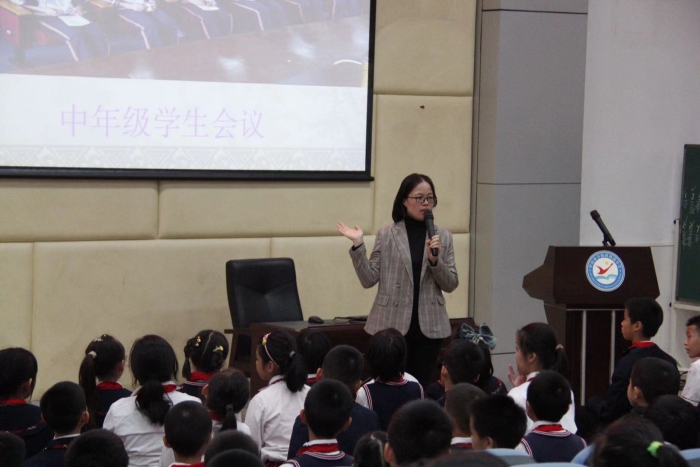 第一環節,鎮南小學中年級級組長高杰輝老師總結了開學以來同學們在學習、紀律等各方面的表現,表揚了一批能夠認真遵守學校的各項規章制度、禮貌待人、書寫端正、路隊整齊的先進學生,并號召大家要向這些先進同學學習。同時高老師也表揚了中年級學生的主人翁意識越來越強,很多學生在學校里都擔當了重要的角色,成為了低年級同學的學習榜樣。在衛生方面,各班級內務能做到整齊劃一,地面墻面一塵不染。接著,高老師指出了部分同學在日常學習生活中存在的一些不文明、不得體的行為,要求同學們要注重自身素質提升。最后,高老師向中年級全體學生提出了要求:勤學、慎思、友愛,要求孩子們在學習中勤奮細致、慎思篤行,在與同學們相處中和諧友愛,努力成為一名優秀的鎮南學子。