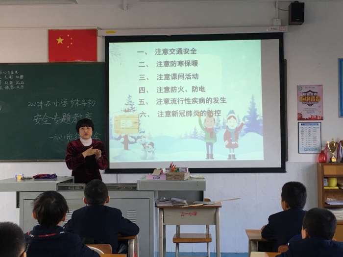 為了切實抓好學校安全防范和教育管理工作,讓學生樹立安全意識,具備防范能力,近日,古一小學扎實有效地開展歲末年初安全教育和防范工作。2020年12月28日上午,六(1)班有序開展年末安全教育主題班會。本次主題班會,主要從以下幾個方面講解安全知識,進一步增強學生的安全意識和自我保護意識的本領:一、注意交通安全;二、注意防寒保暖;三、注意課間活動;四、注意防火、防電;五、注意流行性疾病的發生;六、注意新冠肺炎的防控。孩子們通過班會學習,明白了在這特殊時期,一定要讓警鐘長鳴,牢固樹立安全防范意識。
