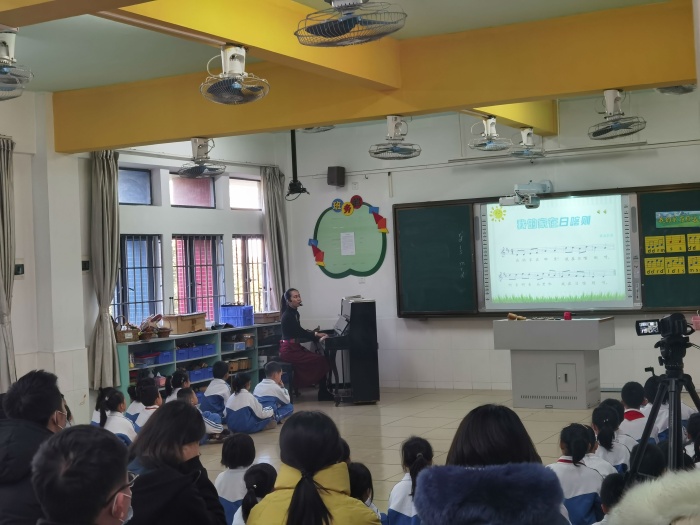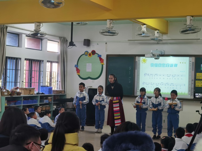 柯宜君老師執教《我的家在日喀則》一課,課堂設計了豐富的音樂實踐活動,引導學生主動參與到活動中。通過聆聽、歌唱、律動、樂器伴奏等層層遞進的手法,讓學生在豐富的活動中體驗、表現音樂。在課堂上,柯老師以生動的語言和親切自然的教態,引導學生在音樂活動中學習歌曲、感受二聲部、體驗合奏與律動的快樂,營造了良好的學習氛圍。課后,柯老師就本節課進行說課,介紹了教學分析、教學理念、設計思路、教學反思。在點評環節,老師們充分肯定了執教老師的教學設計水平和課堂執教能力,同時,也給予了柯老師寶貴的意見。