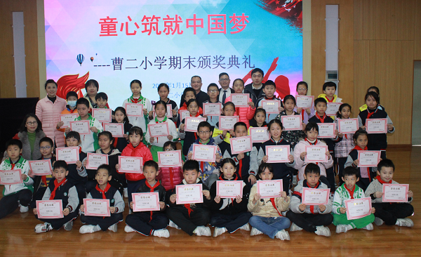 2021年1月15日上午,曹二小學“童心筑就中國夢”結業典禮在階梯室舉行,并通過釘釘平臺在各班教室直播。忙碌而充實的一學期即將畫上圓滿的句號,同學們將迎來愉快的寒假。散學典禮在少先隊員的出旗儀式中正式拉開帷幕,在莊嚴的出旗曲中,大隊長和旗手邁著堅定的步伐,精神抖擻地進行出旗儀式。