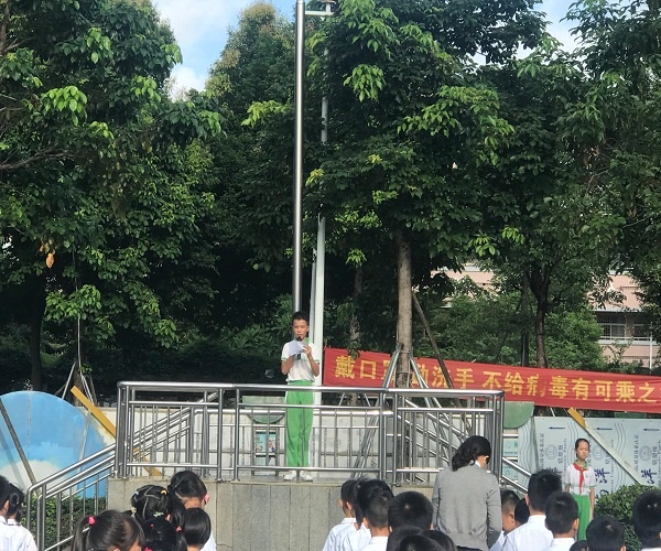 此次升旗儀式后,由六(4)班的李睿陽同學作為學生代表進行了以“拒染毒品,向陽花開”為主題的國旗下講話。6月26日為國際禁毒日,李睿陽同學講到,所謂:“一朝吸毒,十年戒毒,終生想毒。”生命只有一次,僅有一次。父母給予了我們多姿多彩的生命,是為了裝點祖國的大好河山,去以自己的美,體現祖國的美。而不是讓我們去吸毒,去污染那純凈而湛藍的天空。那美好的人生,毒品不應該在我們人生道路上出現,以致影響了我們的前途,危害了我們終生。用潔凈的心靈去感化他人,將會是一個高潮的開始。