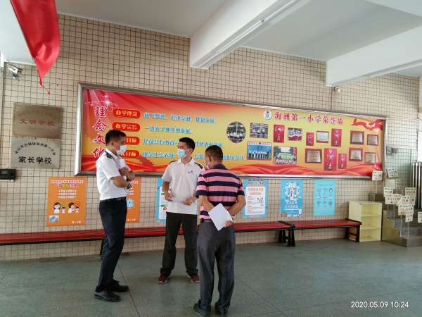 5月9日上午,海洲第一小學作為第三批返校學校接受了上級領導的驗收檢查。本次檢查工作,由古鎮鎮教育事務指導中心李瑞良老師擔任組長。參與本次的檢查工作的還有鎮教育事務指導中心的謝海濤老師和疾控中心、衛生監督所和食藥監的三位同志。