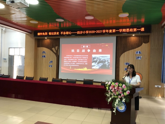 為讓廣大學子牢記由鮮血和生命鑄就的中國人民抗日的偉大歷史,牢記中國人民為世界反法西斯戰(zhàn)爭勝利做出的偉大貢獻,2020年9月3日下午,四沙小學2020學年第一學期思政第一課開講。課程由四沙小學德育主任盧玉冰精心策劃、黨支部委員鄺妙婷主持、四沙小學黨支部書記、校長歐慧芳主講。主課堂設(shè)在階梯室,除主課堂班級外,其他班級學生在課室通過釘釘直播觀看學習。