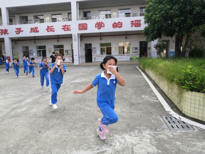 上午8時40分,“嗚嗚嗚……”一陣陣急促的警報聲在校園內響起。各班課室里正在上課的師生們立刻停下了教學和學習活動,在上課老師的組織下有序地從各班課室里疏散出來,沿著平時指定的路線奔向田徑場。警報聲響起時,在思齊樓前樓三樓最西邊的三4班正在上語文課。聽到警報聲,學生們立刻在老師的指揮下,跑出課室,沿著走廊向東跑,到了三8班課室后門,再向北拐穿過連廊。連廊的盡頭是機房。同學們在機房前再沿走廊向東拐,下樓梯,繞過一樓花圃,按照指定的路線繼續向田徑場跑去……