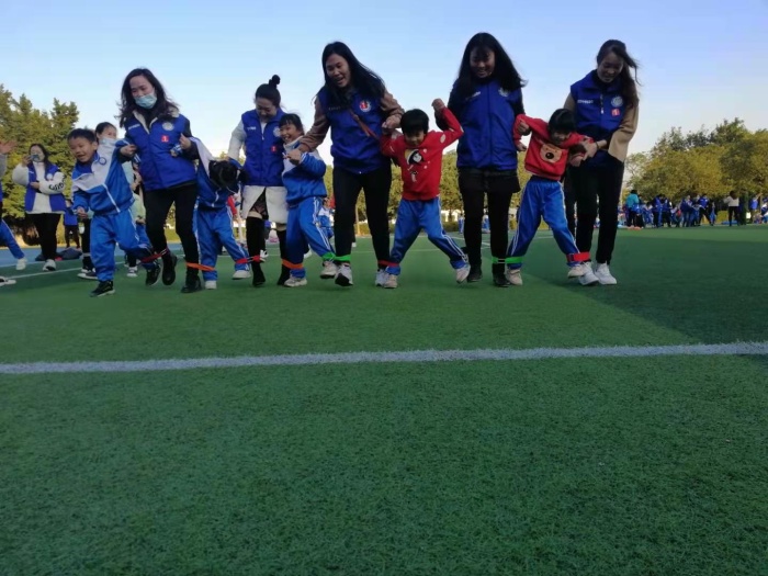 最緊張的是10人11足。裁判發令后,5個家長5個孩子組成的團隊快速出發。有些家長比小孩子高,很多家長都是吊著小孩子的小手跑的;有的團隊跑著跑著,不知道是誰慢了或者絆倒了,結果累得全隊都摔倒了。在一聲聲的“加油”聲中,摔倒的隊員好不容易又站了起來,繼續進行比賽。