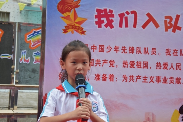 隨后,新隊員代表成俊雅同學(xué)發(fā)言。她表示:從現(xiàn)在開始要以一名優(yōu)秀少先隊員的標(biāo)準(zhǔn)嚴(yán)格要求自己,好好學(xué)習(xí)、熱愛集體、關(guān)心他人、努力進取,爭做讓學(xué)校增光。在大隊副輔導(dǎo)員王曼文老師的帶領(lǐng)下,隊員們莊嚴(yán)宣誓加入中國少年先鋒隊,我們可以看到那一棵棵幼苗在陽光的照耀下、雨水的滋潤下茁壯成長。