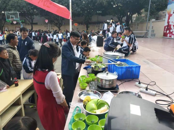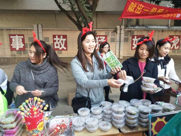 義賣活動前,各班的老師、家長、同學正有條不紊地搬運物品,整理攤位。瞧!那制作精美的海報,那琳瑯滿目的物品,那令人垂涎三尺的美食,還有那創意十足的展臺……到處都洋溢著濃烈的義賣市場的氣氛。到了三點半,義賣準時開始啦!頓時,操場上熱鬧起來了,到處是拿著錢包、滿是期待的同學們。各個攤位前都圍滿了顧客,家長售貨員和學生售貨員有的笑容可掬,靜靜地等待著顧客的光顧;有的扯著嗓子大聲叫賣;還有一些搞起了大甩賣,買一贈一,低價處理。孩子們忙著在各個展臺間不停穿梭,東張張西望望,生怕好東西都被搶購完了。而這次最搶手的,無疑是五花八門的、色香味俱全的美食啦!只見各個美食攤檔前盡是人頭攢動,川流不息。其中,三沙小學游學偉校長開的云吞攤檔生意最是火爆,學生顧客和家長顧客在攤檔前排起了長龍,等著購買游學偉校長做的云吞。游學偉校長盡管都忙不過來了,卻樂得合不攏嘴。在這個暖意濃濃的下午,同學們在笑聲中買到了自己想要的商品,收獲了一下午的快樂時光,最重要的是,獻出了自己的一份愛心。