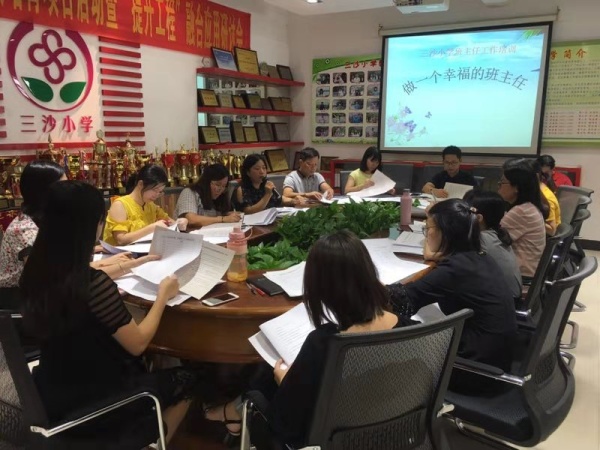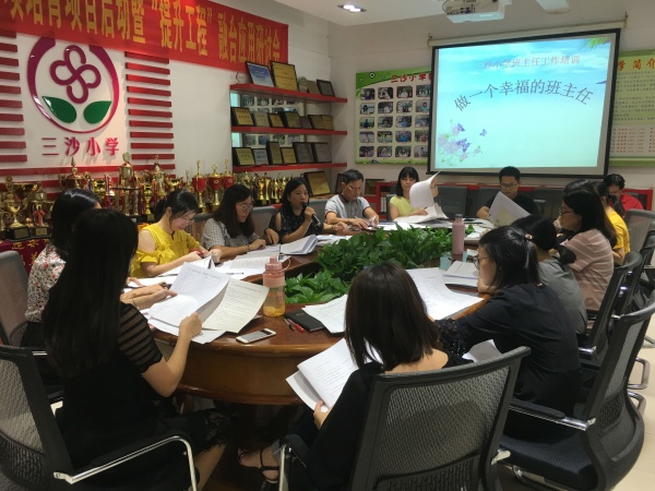 班主任是學校完成教育教學任務和實現教育目標的重要保證。為了提高班主任工作水平,橫欄鎮三沙小學于9月20日下午在會議室里開展了以“做一個幸福的班主任”為主題的班主任培訓活動。