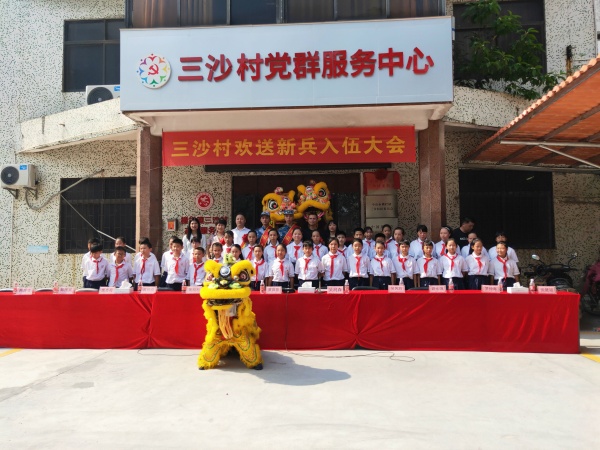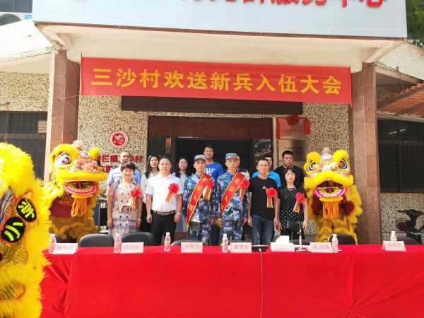 在新兵歡送活動(dòng)中,少先隊(duì)員們?yōu)閼?yīng)征入伍的新兵及家屬佩戴上鮮艷的大紅花,大家都高興地笑了。在新兵及村委領(lǐng)導(dǎo)發(fā)言后,少先隊(duì)員們與新兵進(jìn)行了合影留念。隨著熱鬧的鞭炮聲,歡送儀式正式開始。新兵們走到最前面,送別的家屬及村委領(lǐng)導(dǎo)們緊跟其后,隨后的就是三沙小學(xué)的鼓號(hào)隊(duì)。隊(duì)員們排著整齊的隊(duì)伍,敲鑼打鼓,吹奏著響亮的號(hào)曲,一直送到了新兵集合上車的地點(diǎn)。隨行的還有治安巡邏人員,他們一路跟著歡送隊(duì)伍,安全護(hù)送著隊(duì)伍到達(dá)集合地點(diǎn)。整齊的隊(duì)伍、歡快的鼓聲吸引了大批群眾圍觀,熱鬧非凡。