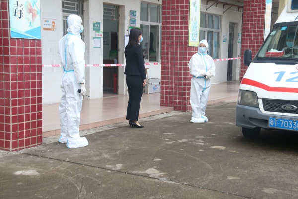 上午第三節(jié)課上課時,初三(3)班任課教師突發(fā)身體不適,體溫檢測37.3度,帶有咳嗽頭疼等癥狀,并在14天內(nèi)與疫情發(fā)生地人員有接觸,被護送到學(xué)校觀察3室進行等候,校醫(yī)到場后,給發(fā)熱老師核實體溫,詢問并登記該老師流行病學(xué)史,隨即向?qū)W校防控領(lǐng)導(dǎo)組負責(zé)人報告情況,學(xué)校負責(zé)人根據(jù)反映的情況立即通知橫欄醫(yī)院安排救護車把患者接到醫(yī)院做進一步的檢查。待醫(yī)院核實情況后,隨即向鎮(zhèn)防疫部門匯報相關(guān)情況,并在防疫部門的指導(dǎo)下對相關(guān)學(xué)生、教師進行管控,對涉及室場進行消毒及相關(guān)后續(xù)工作。同時做好學(xué)生心理輔導(dǎo)和對家長進行情況反饋。