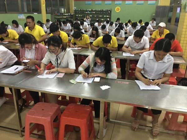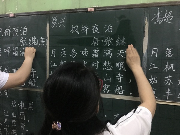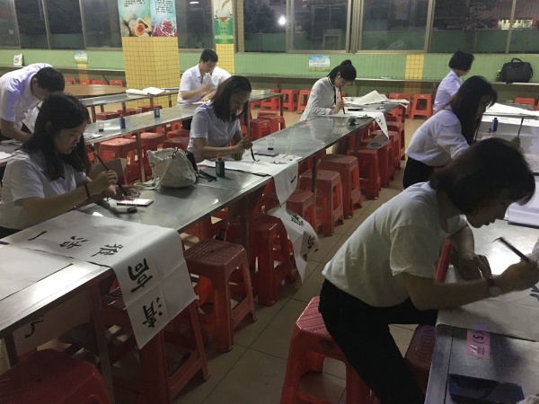 接著是教師組的比賽,教師組的比賽項目有硬筆、軟筆、粉筆三大類,老師們根據個人特長限報一樣參賽。晚上7點,比賽正式開始,所有老師都全神貫注、一絲不茍地暢快書寫,在小小的方格之間揮灑書寫之豪氣,現場緊張而又激烈,隨著比賽終了哨聲響起,老師們統一停筆,隨后評委逐一收取作品進行評審,評出師生各類獎項若干,獲獎的老師、學生將代表學校參加“橫欄鎮第四屆規范漢字書寫大賽”的決賽。