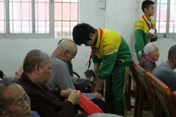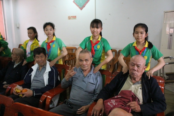剛到橫欄福利康樂中心,在大隊輔導員張勇老師的安排下,同學們便立即的行動起來,分組為老人們打掃院子,擦窗戶玻璃,清理蜘蛛網,并且滿懷熱情地走到老人的身邊,噓寒問暖,給老人們捶背等。同學們純真的表情,親切的話語,使得老人們樂不可支,其樂融融。 在敬老院里,同學們把全校同學的愛心水果、餅干、牛奶等慰問品送到每一位老人們的手中,老人們不停地贊嘆著,看著這群懂事又天真的孩子們,高興得合不攏嘴,整個敬老院里到處都洋溢著溫馨、祥和的氣氛。看到老人們臉上洋溢的燦爛笑容,同學們也會心地笑了,整個敬老院充滿了歡聲笑語。