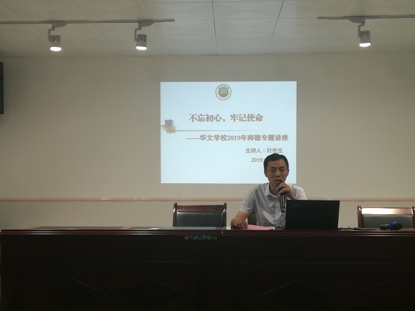 本次講座由華文學校德育處葉冬生主任主講。首先,葉主任帶領全體教師認真學習師德師風建設重要文件材料,教育引導廣大教師熟知師德規范的底線和紅線,恪守職業道德操守,不斷加強師德修養,立德樹人、為人師表、廉潔從教。