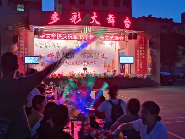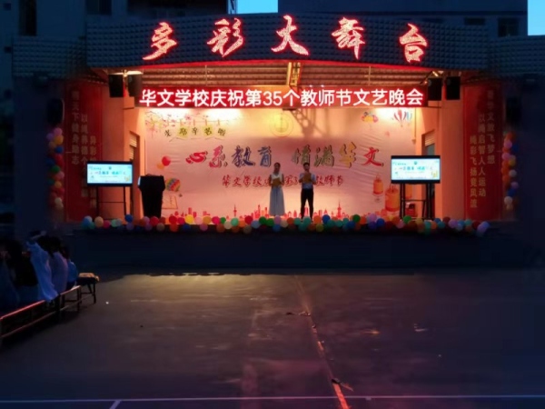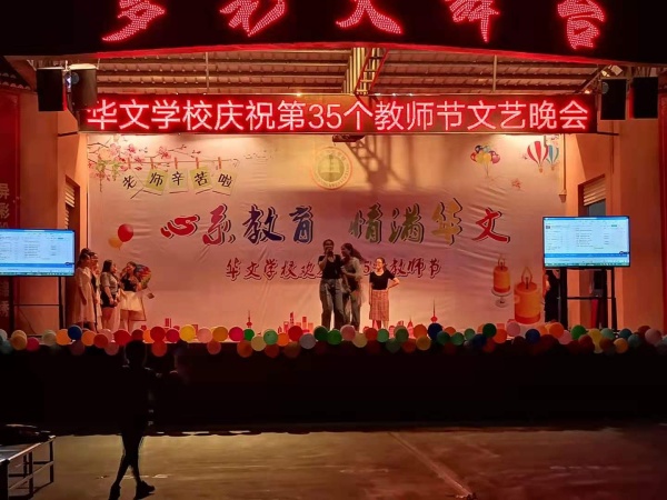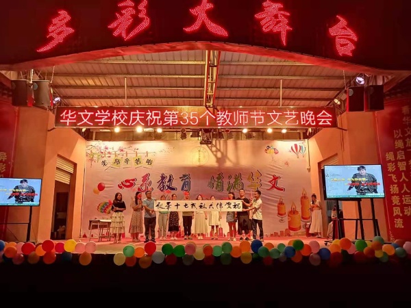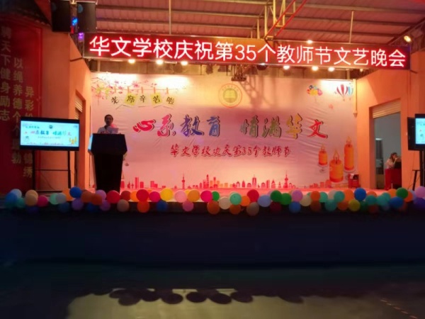 晚會在熱烈的氛圍中舉行。首先,由謝春生校長發表了熱情洋溢的節日致辭。他指出,一年來,華文人勇于擔當,踏石有印,碩果累累的背后是全體華文人共同奮斗的結果,尤其是奮戰在教學一線的教師們,借此機會向他們致以節日的問候和最衷心的感謝,期待相約未來,共創華文學校更美好的明天。