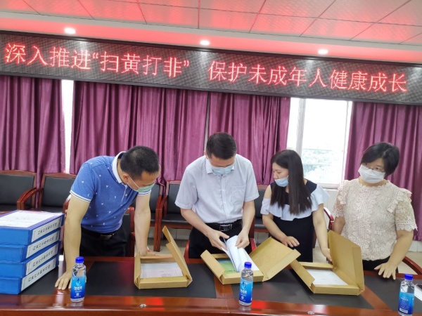 接著,檢查組一行到達三樓會議室聽取學校關于“掃黃打非”的專題匯報,并對本學年學校開展的“掃黃打非”專題活動之主題班會、視頻教育、繪畫比賽、讀書月等的活動方案、活動照片、會議記錄等一系列資料進行詳細的檢查。