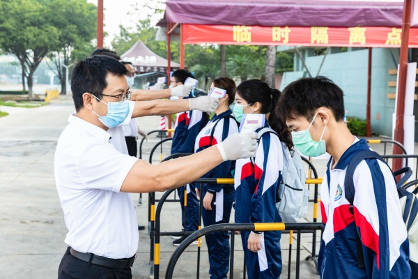 學校大門是校園疫情防控的第一道防線,故演練拍攝首先從學生進入校門開始。校門口拍攝包含了三個場景,一是學生戴口罩,按要求進行排隊,由教師測量體溫。二是有學生出現體溫異常,送至隔離區,由校醫進行復檢。三是學校老師或外來人員進入學校前進行粵康碼的掃描。為了呈現良好效果,需要不斷重復,但是,“學生”毫無怨言,只希望能為順利復學盡自己一份力。