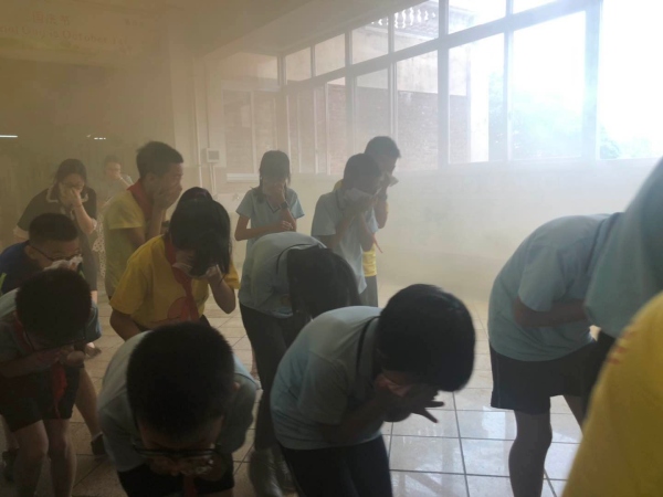 上午8點(diǎn)55分,各樓層突然濃煙滾滾,刺耳的警報(bào)聲響徹校園,這是沒(méi)有提前通知學(xué)生的演練,此時(shí),全校同學(xué)們?cè)诳迫卫蠋煹慕M織下,迅速打濕毛巾,捂住口鼻,彎腰,有序撤離危險(xiǎn)區(qū)域,迅速到達(dá)操場(chǎng)的安全地帶,所有在辦公室的老師也積極到現(xiàn)場(chǎng)指揮學(xué)生疏散,整個(gè)活動(dòng)井然有序。到達(dá)操場(chǎng)后,各班班主任和科任老師清點(diǎn)人數(shù),并層層上報(bào),通過(guò)兩次的演練,在短短的兩分鐘多鐘,全校師生全部安全疏散完畢。
