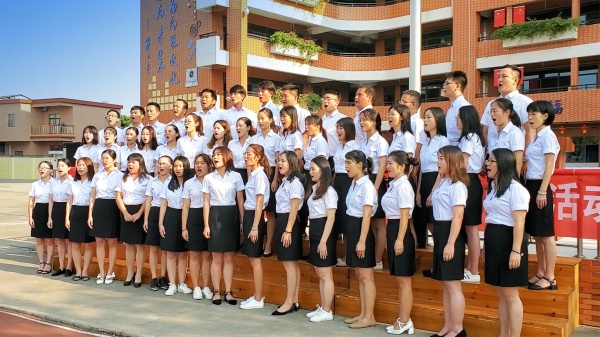 在鄭書記的講話后,學(xué)校教師合唱隊(duì)激情演唱《紅星歌》,表達(dá)對(duì)偉大的黨和祖國(guó)真摯的愛和祝福。何穎詩(shī)老師帶領(lǐng)全體師生齊唱《歌唱祖國(guó)》和《我和我的祖國(guó)》。在少先隊(duì)大隊(duì)輔導(dǎo)員劉影芳老師的帶領(lǐng)下,高呼“祖國(guó)萬歲!”全體師生揮舞國(guó)旗,深情演唱,以昂揚(yáng)的精神面貌、嘹亮的歌聲、振奮人心的口號(hào)表達(dá)了對(duì)祖國(guó)的美好祝福,表達(dá)了對(duì)祖國(guó)、對(duì)人民、對(duì)學(xué)校的熱愛。