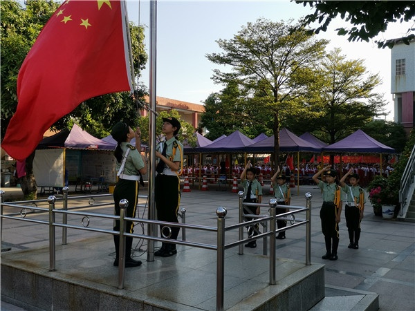 活動(dòng)就在主持人莊嚴(yán)的宣告聲中開始。首先進(jìn)行升旗儀式,全體師生面向升旗臺(tái),齊唱國(guó)歌,瞻仰著鮮艷的五星紅旗冉冉升起。接著,出隊(duì)旗,火紅的隊(duì)旗如同火炬一般,引領(lǐng)師生前行的方向;敬隊(duì)禮,敬上心中最崇高的敬意;唱隊(duì)歌,唱出心中最嘹亮的聲音。
