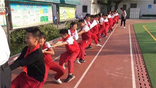 短暫的中場休息過后,緊接著進行搭橋過河。運動員們都非常給力,搭檔之間的配合都十分默契,你追我趕,尤其是高年級的運動員,動作利索,將墊子一取一甩一鋪,隊員彼此縱身一躍一跳,過程緊湊而又不失活力;最精彩的莫過于最后一個項目拔河比賽了。只見各個班級的運動員都氣勢十足,如同猛虎下山、蛟龍出海一般。只見他們雙方緊咬牙關,身軀后仰,重心向后,你的腳尖頂著我的腳跟,都使出了渾身的力氣,過程異常精彩,贏得全場尖叫聲、吶喊聲持續不斷,并將活動推向了高潮。