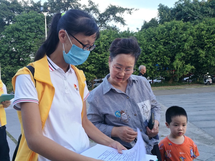 當天傍晚,在三小唐秉晶校長的帶領下,開發區第三小學志愿者走進了濠頭聯富社區尚城小區、麗港城小區,協助社區干部派發創文倡議書以及幫助居民進行創文小知識問卷等。